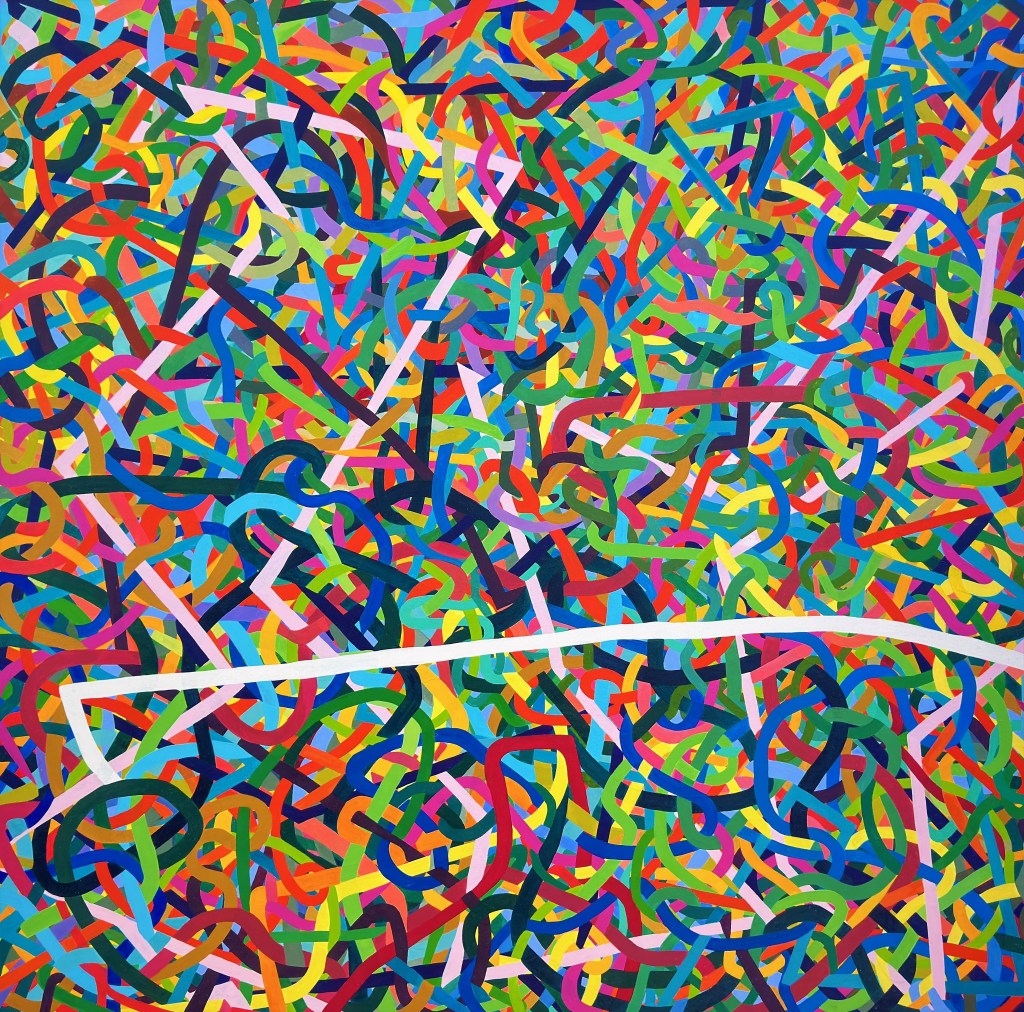 Sobald sich eine Idee im Kopf eingenistet hat, wird sie als «digitaler Entwurf» und hier ausgearbeitet: Linien, Kreise, ineinanderfliessende Wellen und Krümmungen geben der Idee ihren Umriss, ihre Form, ausgewählte Farben füllen die durch Linienkreuzungen entstandenen Felder. In weiteren Bearbeitungsschritten wie Reduktion, Auslöschung und Hinzufügung von Linien und Farben erhält die farbig-skizzierte Rohfassung ihre endgültige Gestalt und wird nun unveränderbar als definitive Vorlage auf Leinwandformat vergrössert. Das Malen des Sujets auf dem bereits grundierten, darüber mit titanweiss zusätzlich präparierten Malgrund kann nun beginnen.